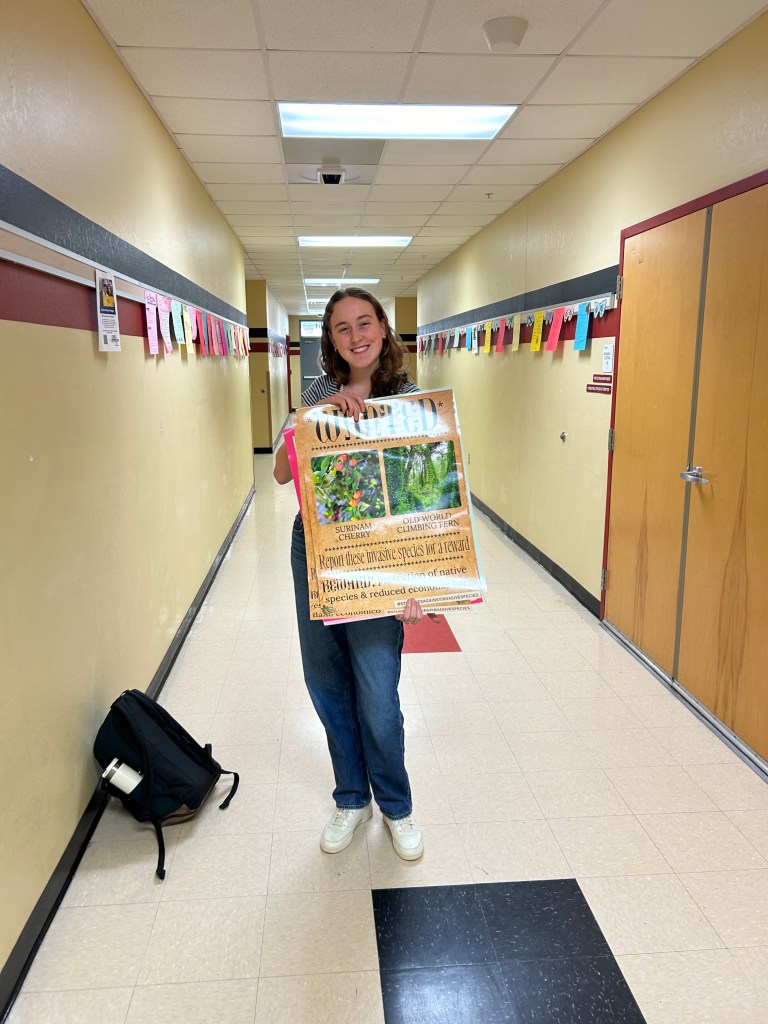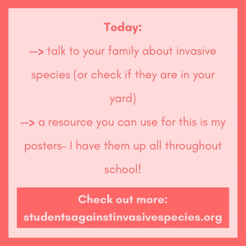 For the first day, talk to your family about invasive species (or check if they are in your yard!). You can bring it up at the dinner table or in the car. Ask if you have any invasives in your backyard or if you think there are some non-native, harmful plants in your garden. If you do, you can report them or remove them (safely). A resource you can use for this is my posters– I have them up all throughout the school! There is information on what you can do to help manage invasives, how they affect us, how to report them, and pictures of some common ones in our area.